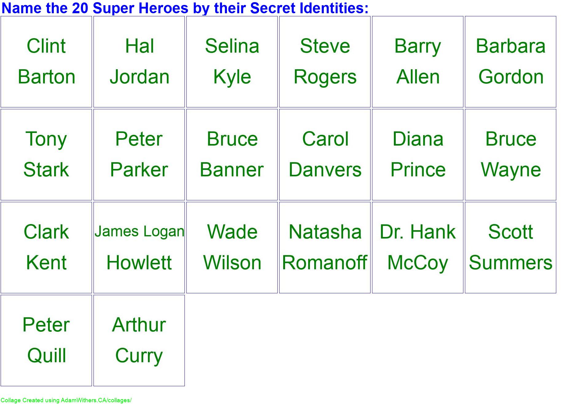 - Name the 20 Super Heroes by their Secret Identities: